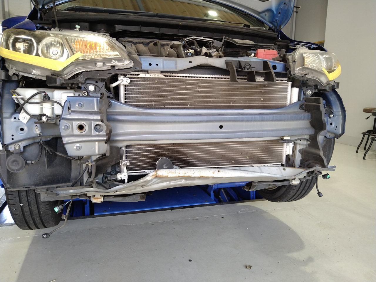 どうやらフロントを突き上げてホーンがコンデンサーに接触してしまいガス漏れが起きていました。